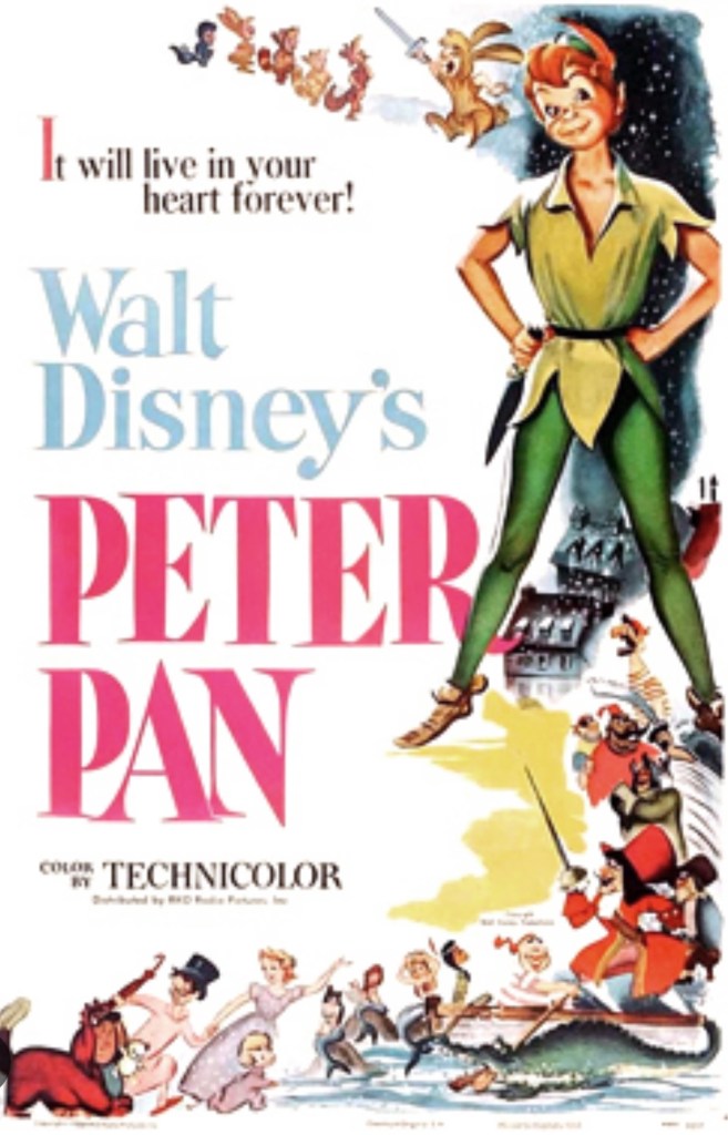As a treat to the poor students at Jefferson Street Elementary just before Christmas break 1960 some wealthy benefactors paid to have the whole school, teachers and students, bused to a movie theater to see a rerelease of Disney’s 1953 animated classic Peter Pan. After the movie we were taken to the homes of these actually middle-class benefactors (the seemed wealthy to us) and given Christmas treats and two large shopping bags of Christmas presents each. It was like Halloween and Christmas combined.