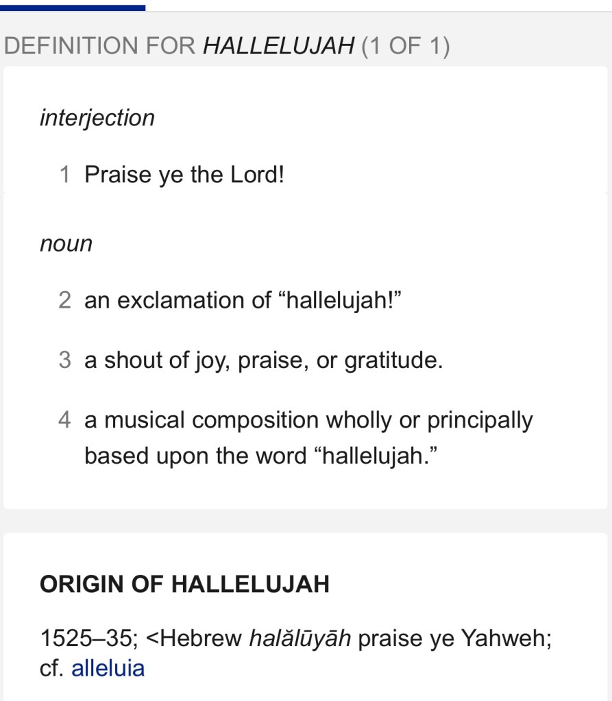 The third definition “shout of joy, praise, or gratitude” in the case of a broken hallelujah might also include “surrender, resignation, and acceptance.”