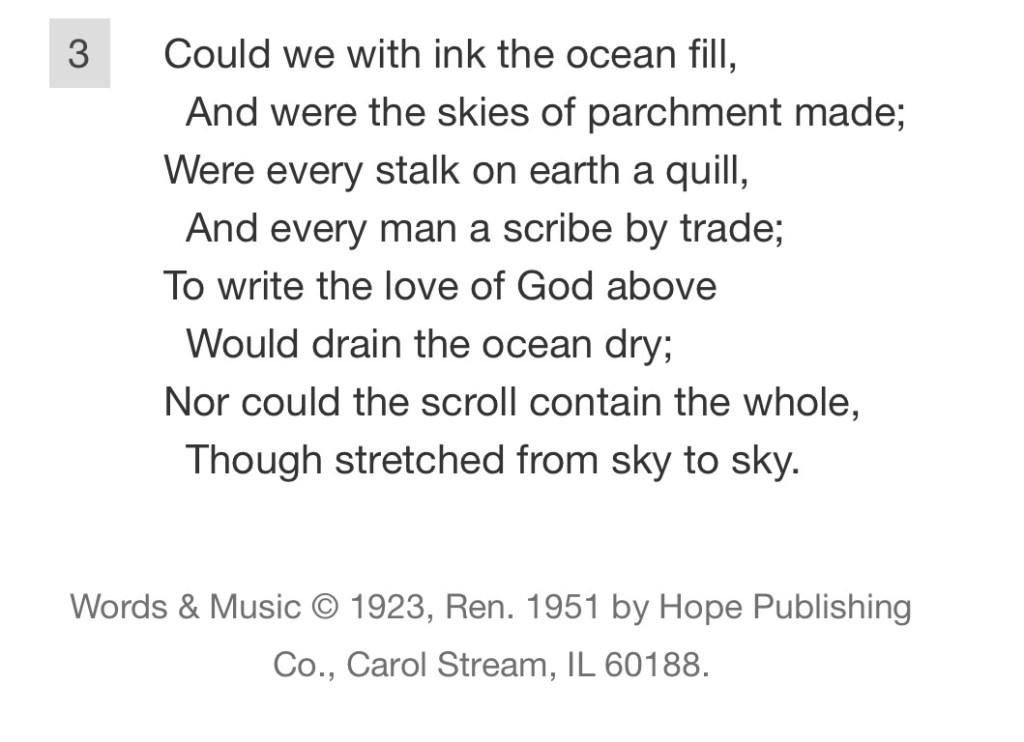 I recall as a young man listening to one of my brother’s records with George Beverly Shea, famous song leader and soloist for Billy Graham’s crusades. The song that struck me most is called “the love of God is greater far”and the third verse was reportedly found scrawled on a wall inside an inmate’s room in an insane asylum: