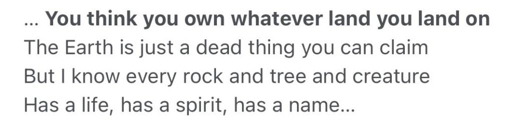 The Western religions of Judaism, Christianity, and Islam all teach that man was commanded to have dominion. That is a convenient commandment as it agrees with Ego’s world view. All three religions believe themselves to be the one true religion and claim “The Lord God is One” and think that means monotheism is the proper interpretation of those words. The Bible phrase “God is all in all” seems to agree with Pocahontas’ wider take on God and religion.