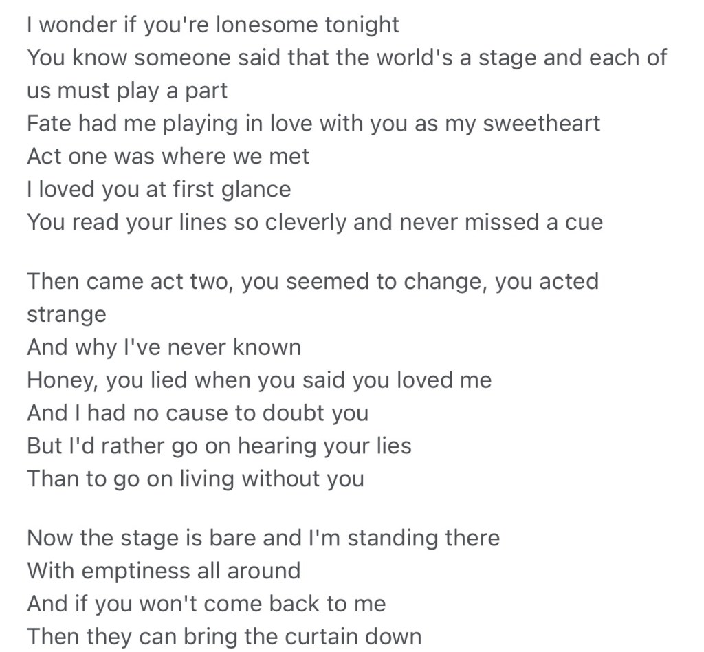 In one of my favorite Elvis songs, Are You Lonesome Tonight, he speaks several of the verses saying: