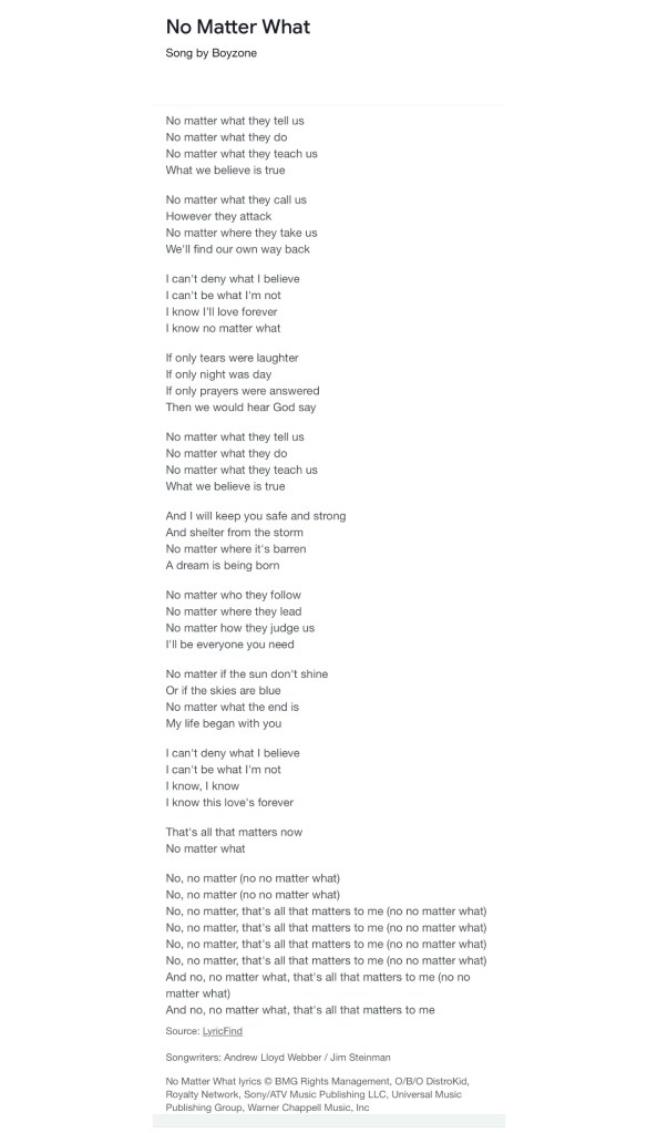 One of my favorite songs to sing is No Matter What made popular some years ago by the Irish boy band Boyzone. The song is also featured in one of my favorite romantic comedies Notting Hill with Julia Roberts and Hugh Grant. That is probably where I first heard it.