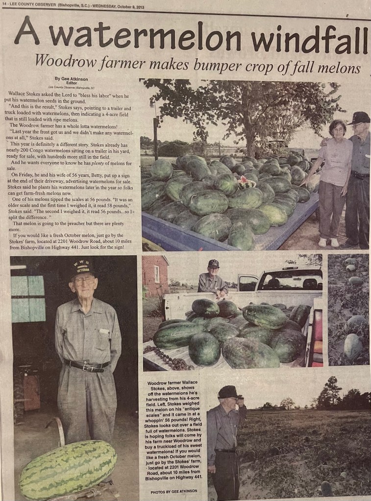 That wonderful water and the sandy soil in that area grows some of the biggest and best tasting watermelons. Five and a half years before Dad passed there was a write-up in the Lee County Observer that I have attached. It was a proud moment for Mr. Stokes as he was proud of his wife and family, his farm, what he grew, and all the friends that he had made in all the years that he had farmed and bought, fixed and resold farm equipment.