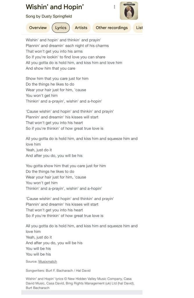There is some real wisdom in this Burt Bacharach/Dusty Springfield collaboration. You won’t get him, her, or that thing you want by thinkin’ and prayin’, wishin’, and hopin’, or by just planin’, and dreamin’ alone. It will take a little action or effort on your part to prime the pump so to speak or start the process working.