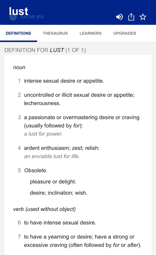 Honest men and women admit the attraction to possess and be possessed by beauty and can see and recognize that depression and despair is the lowest emotion even as ecstasy and elation are the highest emotion. Lust according to the dictionary means: