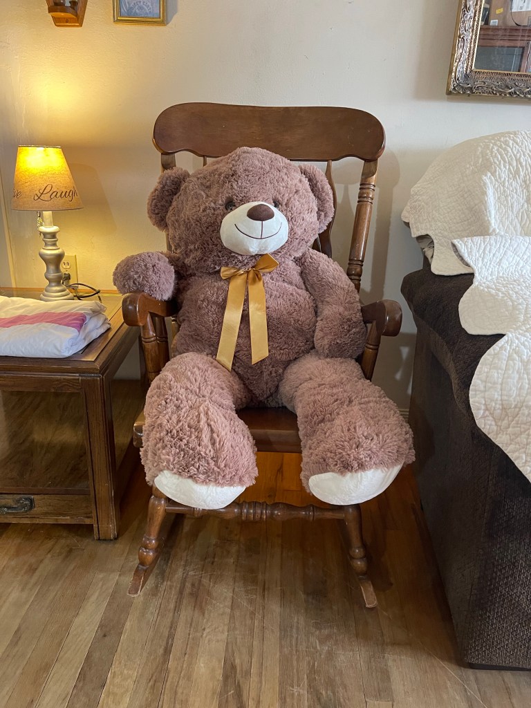 As promised a couple of days ago, pictured above is Emma’s little teddy bear. He or she (I will let Emma decide) measures 52” tall and like Goldilocks famous line I hope Emma will find her T-Bear whatever she decides to call her or him, “Just right.”