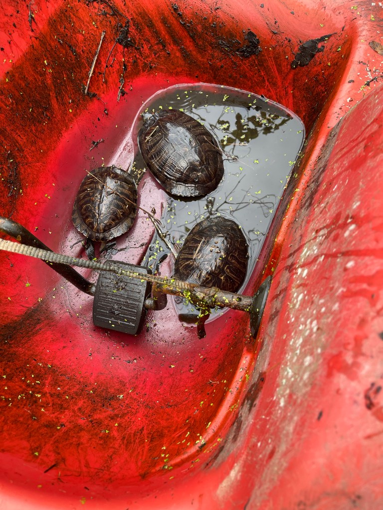 After bailing a while I discover three turtles had gotten caught in one of the pedal wells. I took their picture then freed them, no time for turtle soup today.