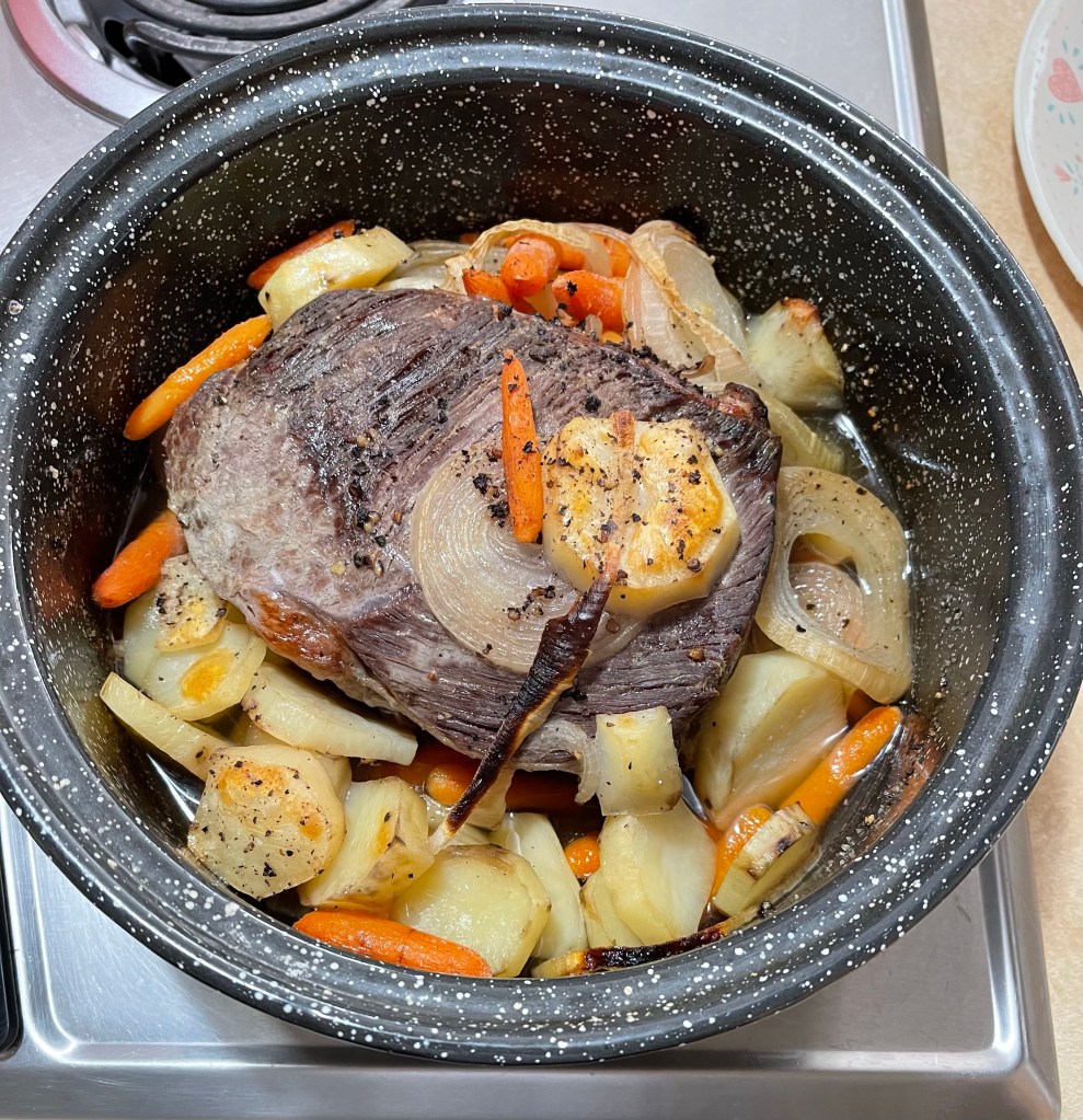 Yesterday, on the second day of my birthday week, I treated myself to a pot roast, the very first one that I ever cooked (pictured above.) On a quick trip to the local Kroger where I always check the discounted meats for bargains, I saw a two pound Nolan Ryan Beef roast. I figured the instructions for how to cook it could be easily found online and they were.