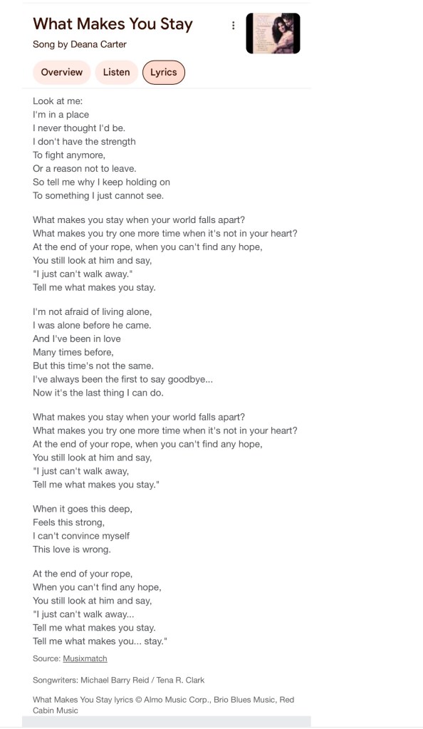 One of the most hauntingly beautiful songs that I have ever heard is on the soundtrack to the Sandra Bullock movie Hope Floats. It asks the question, What makes you stay? Here are the complete lyrics to the song and I attach a link to it below for your listen pleasure.