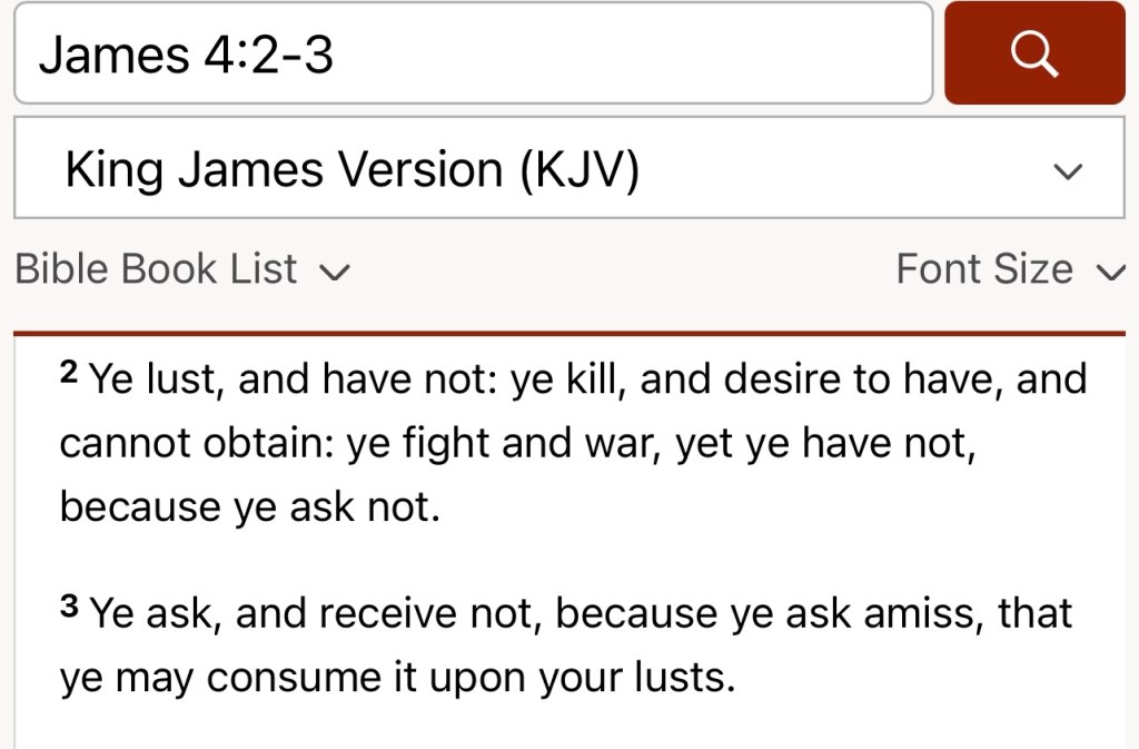Why is it that we do not seem to get what we want? In the book of James the author seems to imply that we do not receive what we ask for because we ask amiss, that our motives are impure and must be correct to get what we ask for.