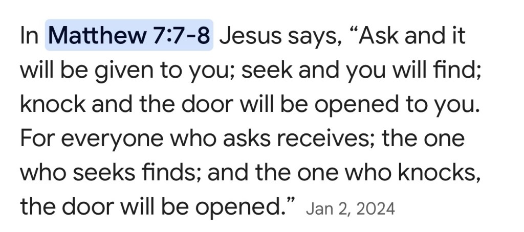 Why then the proverbial caution, “Be careful what you ask for.” I believe that God, the Universe. Is more willing to give us whatsoever we ask for than we are to simply ask. One of my favorite Bible promises is the Ask, Seek, Knock (A.S.K.) Verse: