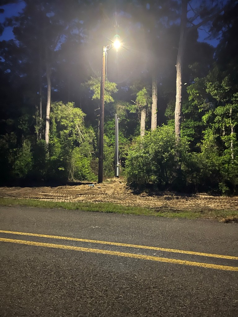 I drove up a little earlier than usual and had intended to nap in the truck and get another hour of sleep before writing and posted my daily blog. Alas, I am awake to the task. I am here at Jay’s Hundred Acre Wood on a duel mission today. We have power to the property and a dandy light that lights up the entire RV Camper Trailer site that I have been working on clearing for a couple of months now. We also have municipal water run to the property, yet a power box with camper hook up and a sanitary frost-free hydrant have yet to be installed. I am here to make arrangements for both of those things to take place. I am neither an electrician nor a plumber so I will see to it that professionals take care of those items.