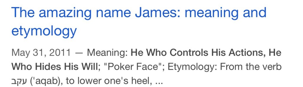 Just today when I was researching the meaning of the name James online I came upon a new shade of meaning. For years I had known only the traditional meaning. James is Greek for the Hebrew Jacob which means “supplanter” or “grabs the heel” from the Old Testament stories about Jacob. I like the newer shade of meaning even better: