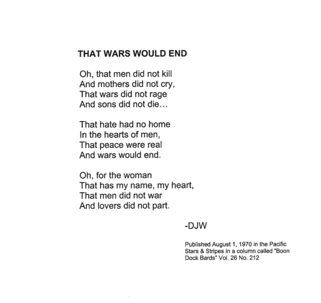 When I was nineteen years old I wrote the following poem. I hope that I have learned a few things since then. Yet, I have learned nothing to change my mind about the foolishness, hellishness, and heartbreak of war.