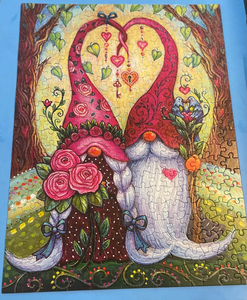 Linda loves to put jig saw puzzles together so I am always on the look out for one (new or used) that she might like. I found three at Walmart for her that I got her for her recent birthday. Yesterday she finished the first of those three. The title of the puzzle per the box is Always and Forever, a beautiful sentiment in English, French, or Spanish.