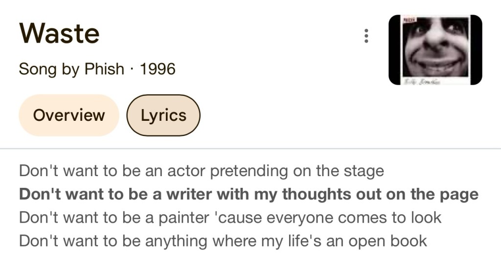 Writing is a personal thing. The first verse of the Phish song Waste comes to mind: