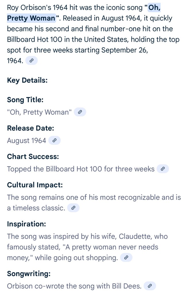 Her reply started him and the co-writer of the song, Bill Dee’s, thinking about pretty women and in moments the iconic song was a reality.