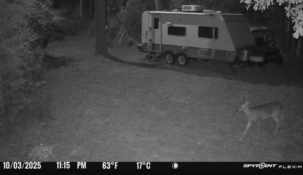 My wife and I both truly look forward to our mid-week adventures in the East Texas piney woods. This rare photo of a buck visiting our camper site was caught a few morning ago while we were at our Houston home. When we are there in Bon Wier Tuesday through Thursday staying the two nights, we often go outside and look at the stars. The critters are too wise or too shy to come this close while we are there. They need not fear the two of us for we mean them no harm, but are truly thrilled to get to share The Hundred Acre Wood with them.