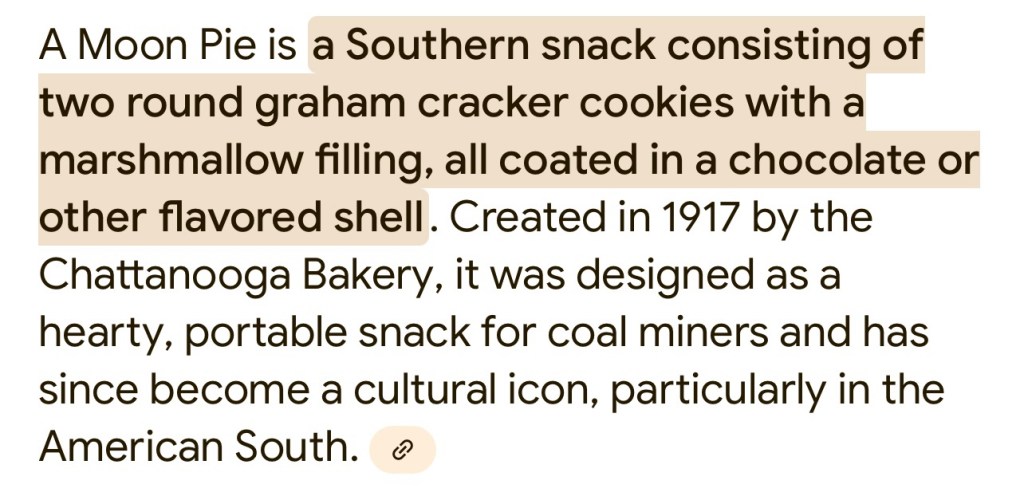 I have a little in common with Moon Pies for we both come from the same home town, Chattanooga, Tennessee. The great southern sandwich cookie treat that tastes a lot like s’mores (the campfire treat made by roasting marshmallows and putting them and a chocolate bar between two graham crackers) is produced by the Chattanooga Bakery and has been since 1917, that is ten years before a Girl Scout leader published her recipe for s’mores in 1927. Moon pies were around forty-three years before I arrived to eat my share. It is a truism among folks my age that there is not much better than a Moon Pie and an RC Cola. Go easy on us all you Coke and Pepsi fans.