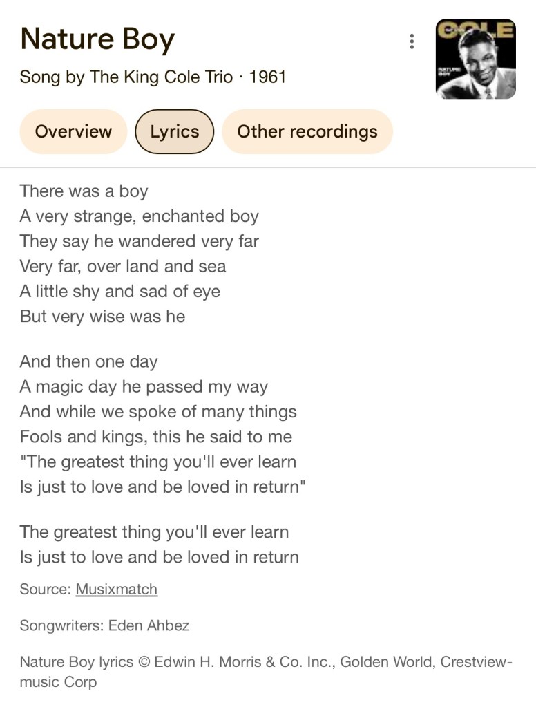 Nature Boys was the name of a sub-culture group of proto-hippies base in Lost Angeles in the forties of whom the song’s author was a member. It is a simple lyric but quite profound.
