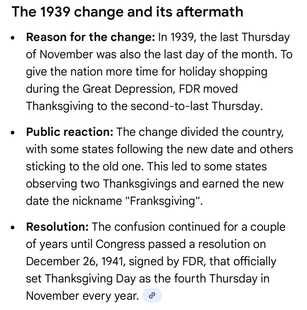 Originally the Thanksgiving holiday was observed on the last Thursday of November, but at the insistence of the retain business owners in 1939 President Franklin Roosevelt changed it to the fourth Thursday of November adding a few days to the Christmas shopping season. I personally benefited from that change because Thanksgiving falling on the second to last instead of the last Thursday in November means that occasionally the 22nd of November, my birthday, falls on Thanksgiving.