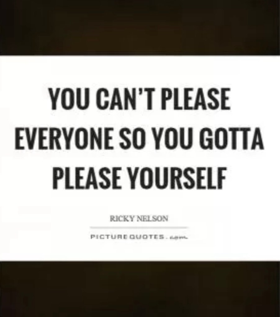 Rick Nelson’s last big hit song Garden Party says it best – “You can’t please everyone so you got to please yourself.” Selfish? Perhaps, but even Jesus great love command says that we are to love God and others as we love ourselves, loving ourselves being, I think, the prerequisite to being able to love anyone else.