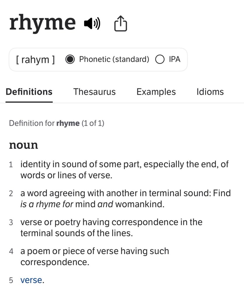 Numbers people are always trying to figure things out, to make things add up. Word people are always looking for the words to explain the situation, trying to make things rhyme. The dictionary defines rhyme as: