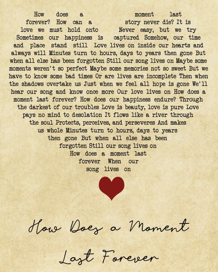 Today’s song answers the question, “How Does A Moment Last Forever?” – “We hear our song and know once more our love lives on.” This is traditional the time of year when we remember those who passed this year and take stock of the memories, the moments from 2025 that we hope will last.