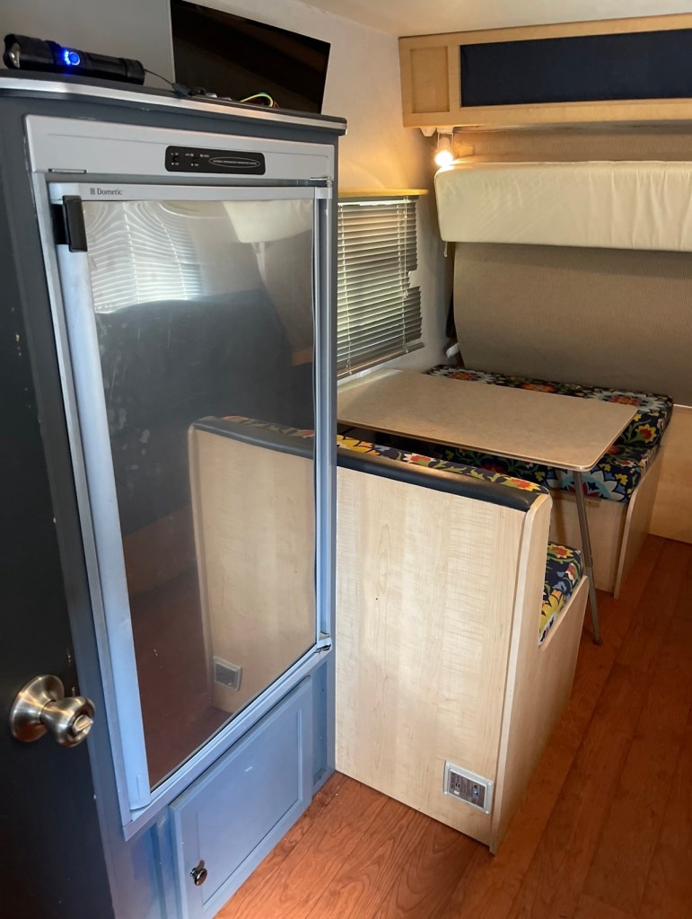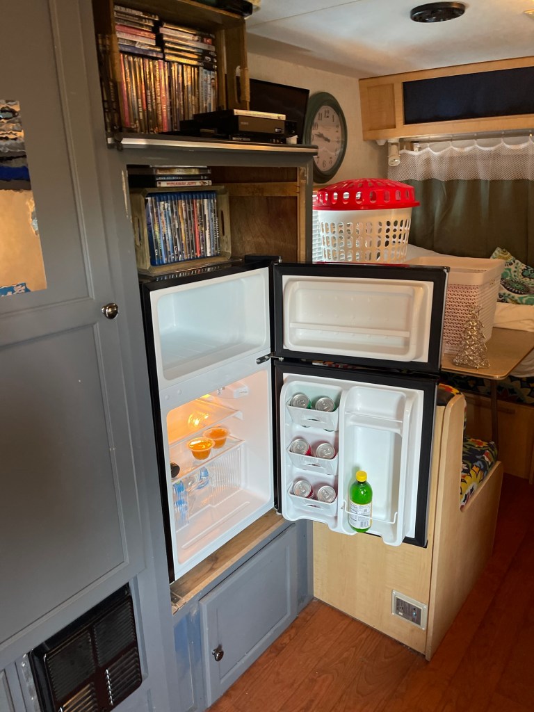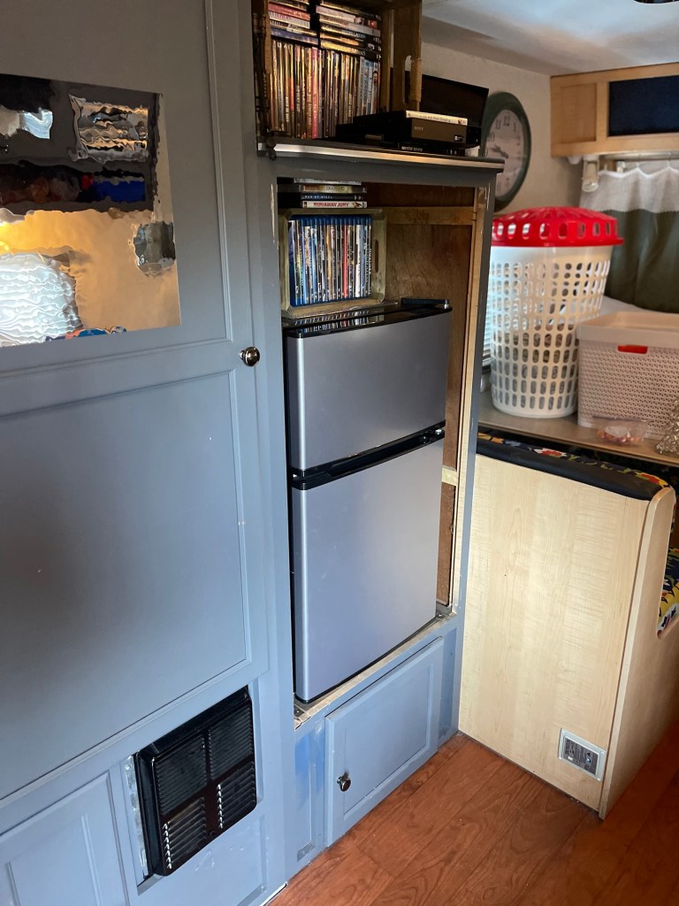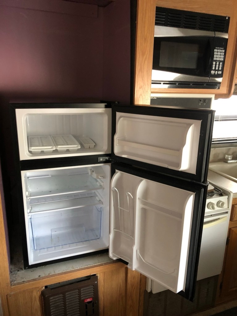 The propane/electric refrigerator in my second RV Camper was much like the one in my first RV camper. The freezer compartment was small and it was one of the first things that needed to be replaced. It took me the better part of a day to change out the first one while I was living in Lone Rock, Wisconsin and working in the area in 2018. Not only did I have a tough time getting it out of the wall, but maneuvering it out of the narrow trailer door was a bear and I ended up scratching the door, floor and even having to replace some upholstery in the dining area near the door.