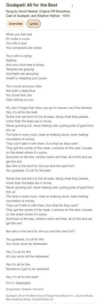 The rich and powerful would have us believe that suffering and deprivation are our lot in life and religion and sad country songs seem to agree. I, on the other hand, think that there is more than enough to go around and that there is no excuse for a few who think they are entitled, that the are better that the rest, the best, kings annointed by God, to have it all and do whatever they please.