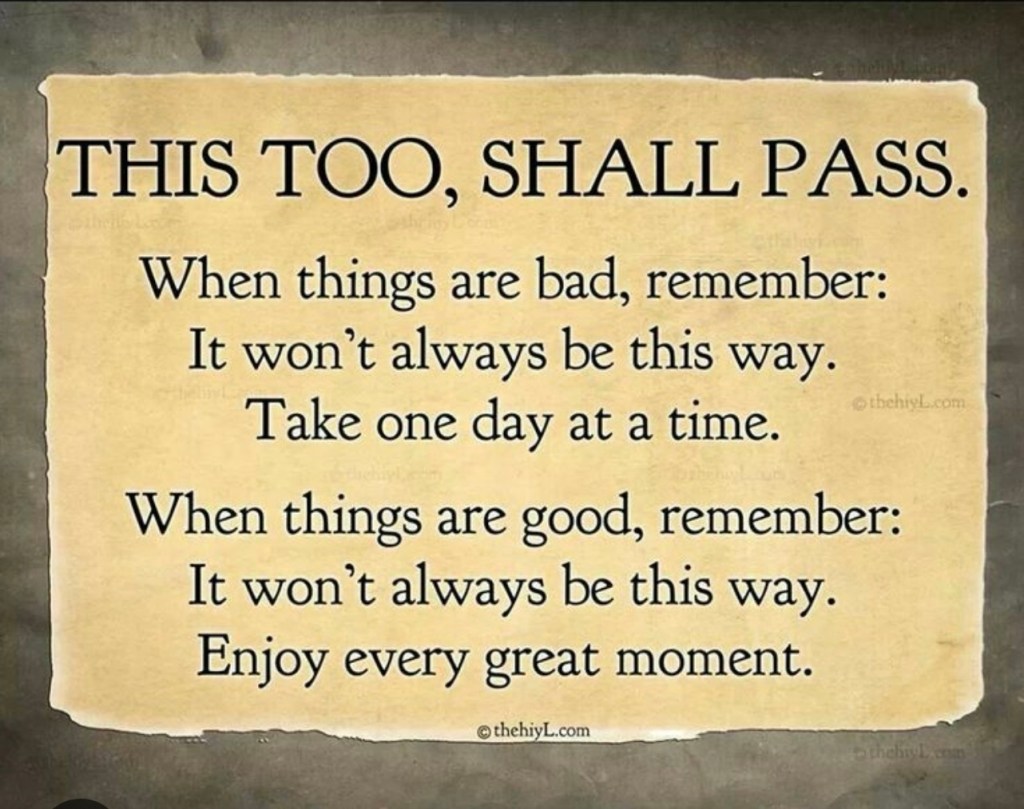 A phrase I learned some years ago is a great comfort to me on restless nights and troubled days, “This, too shall pass.” Troubles come to all of us, they try us and torment us and often we find it difficult, if not impossible, to figure out why or what we were supposed to learn from them. Perhaps the real lesson is just to stand fast until they are past.
