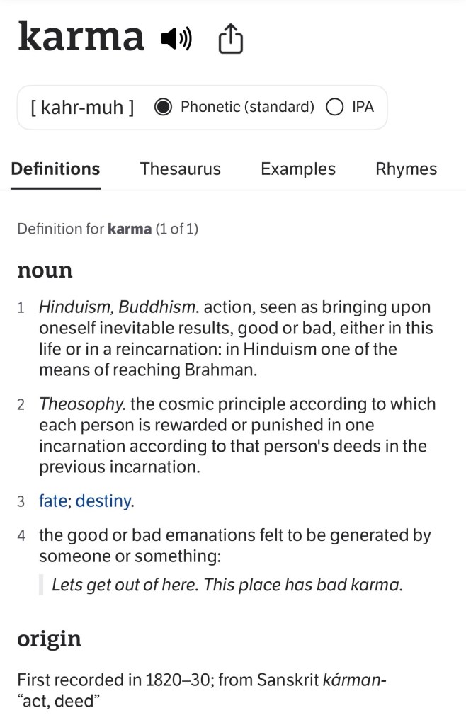 The dictionary defines karma thusly and though I do actually believe that we get to experience as many lives (adventures in time and space) as we choose I do not really believe in fate, destiny, or that God (The Universe) visits the punishment for the sins of the father upon the third and fourth generations nor even upon the first and second generations. Having said that I do believe that there are often consequences to our choices and our actions regarding those choices.