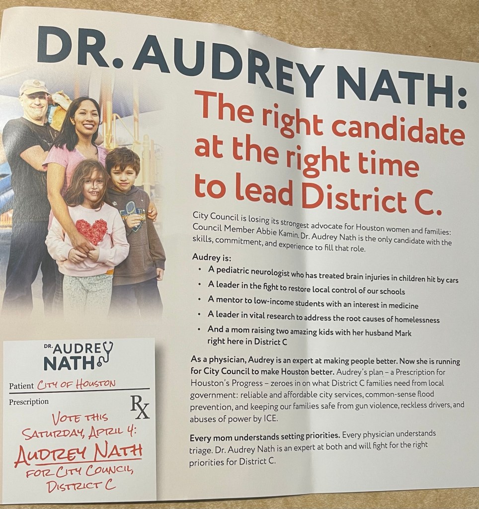 Friday afternoon someone rang our door bell and I opened the door. It was a woman about my own age out trying to talk people into voting for her candidate in a seven person race for an open seat on the House City Council that was left open because the woman who held that office recently stepped down to run for Harris County Attorney. I did not know there was a special election called for Saturday April 4th, to fill that open seat nor that there were seven candidates running to fill that position. All I knew was that this woman my age was out knocking on doors or ringing doorbells and leaving information about her candidate, Dr. Audrey Nath.