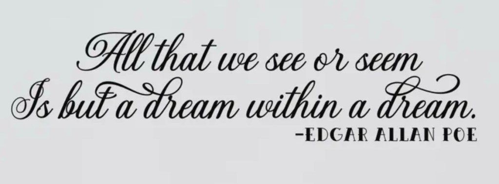 I think, believe, suspect that this life is our dream and that we are the author, originator, producer, director and lead actor. Perhaps as today’s Poe picture quote this life is a dream within a dream. We will awake from this particular dream when we are ready, perhaps to dream another or just to wake up in our own bed, in our place of origin, like Dorothy in the Wizard of Oz realizing that what seemed so very real was only bits and pieces from a more real place.