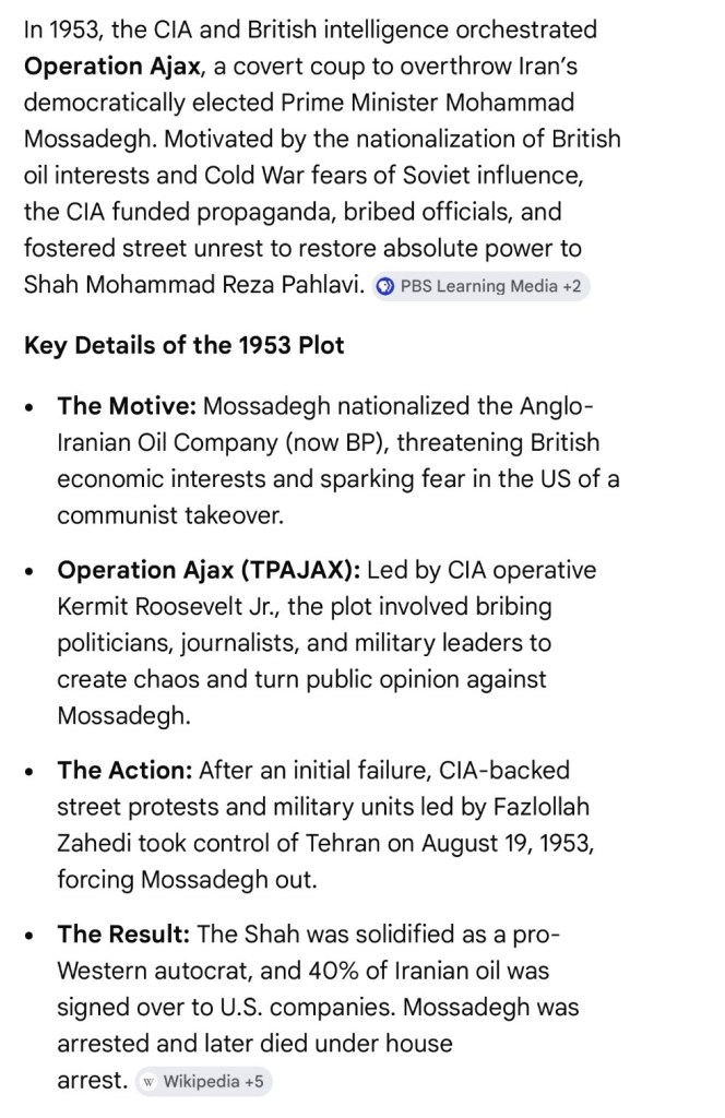 In the 1950’s the C.I.A. sponsored a coup in Iran deposing the democratically elected leader and replacing him with an autocratic dictator:
